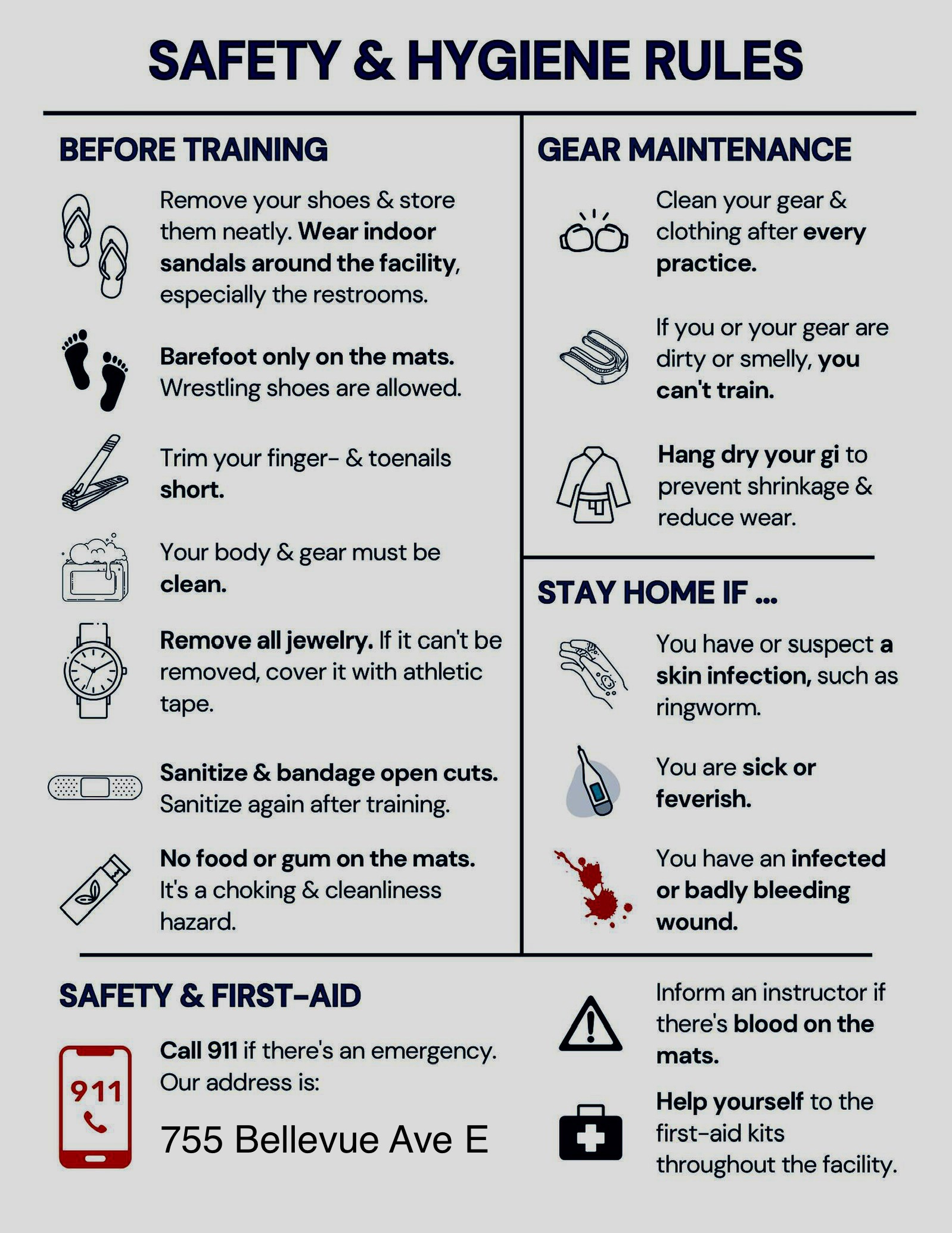 Please take the time to review our Gym Rules and Code of Conduct documents before coming to train. If you have questions, check out our FAQs and feel free to contact us!