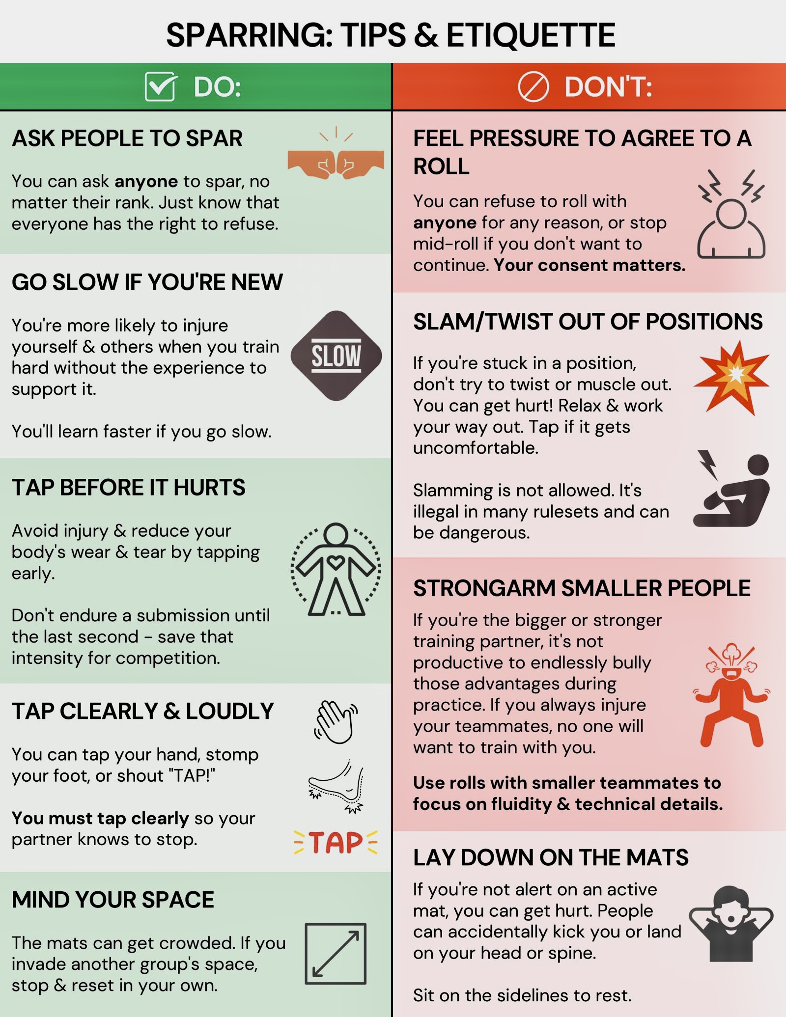 Due to safety concerns, we do not permit techniques with uncontrolled falling body weight while sparring. This includes jumping guard, flying submissions, standing kani basami (flying leg scissors), tani otoshi (valley drop), etc.